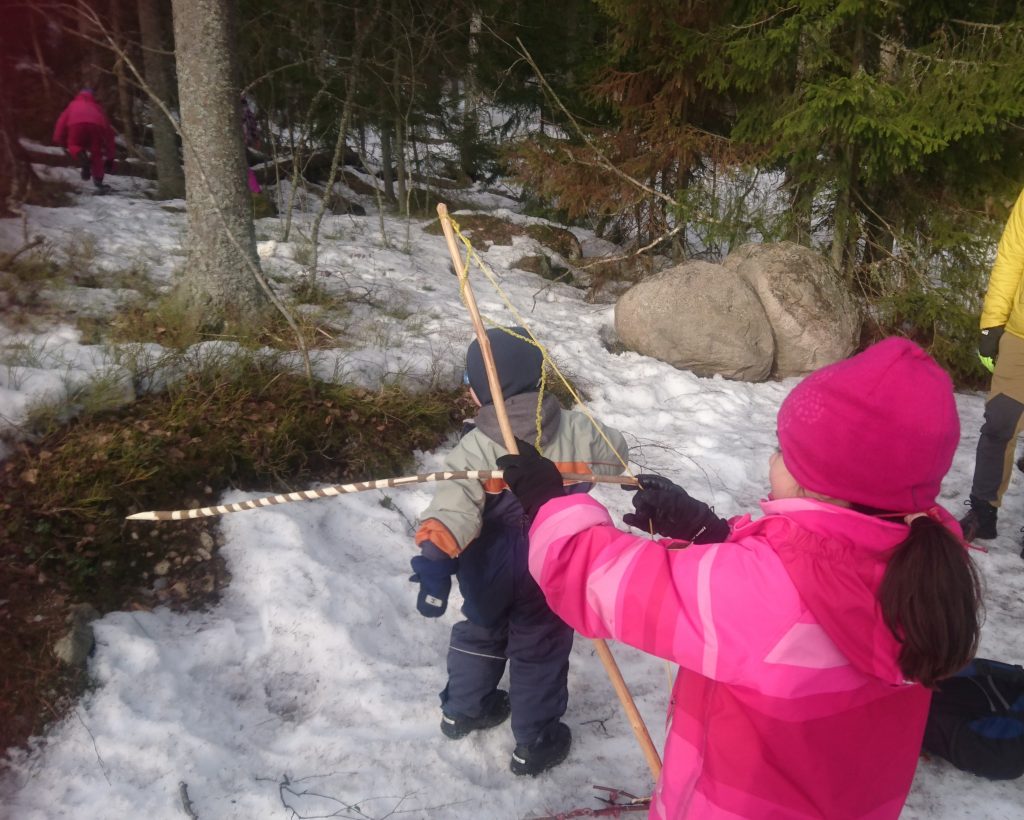 Tyttö virittää taikanuolen Nuuksiossa.