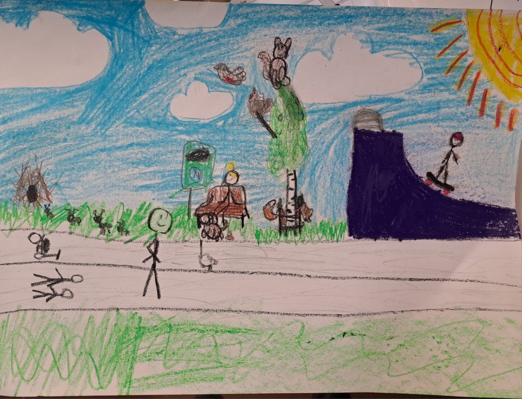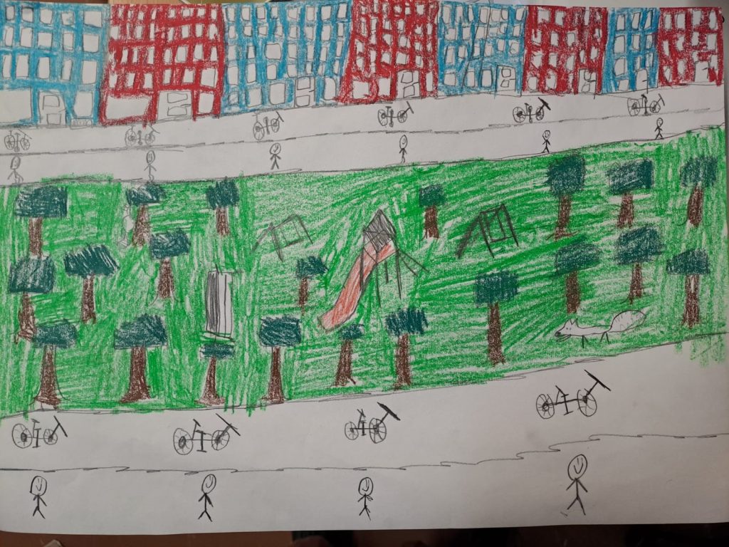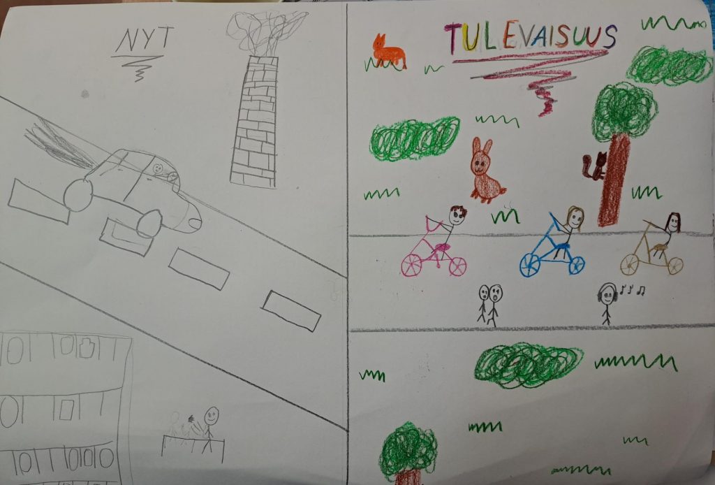 3. Taidetyöskentely luokassa. Oppilaat piirsivät oman näkemyksensä aiheesta ”tulevaisuuden kaupunki". Tehtävänä oli kuvitella, miltä kaupungin keskusta-alue voisi näyttää, jos siellä ei olisikaan autoteitä eikä parkkipaikkoja, vaan pelkkiä pyörä- ja kävelyteitä. Luonto, monimuotoisuus, leikki ja ilo nousivat useimmissa töissä kantaviksi teemoiksi.